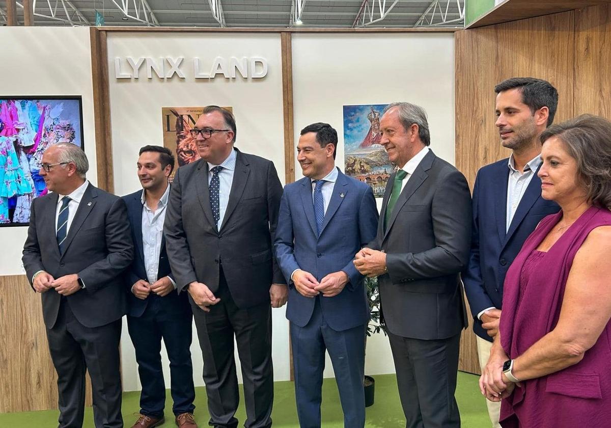 El presidente de la Junta de Andalucía, Juanma Moreno, se paró en el stand. Ya tuvo la oportunidad en sus visitas a las romerías de 2014 y 2022, y a la remodelación del puente del Río Jándula, en 2020, de conocer las joyas del entorno natural.