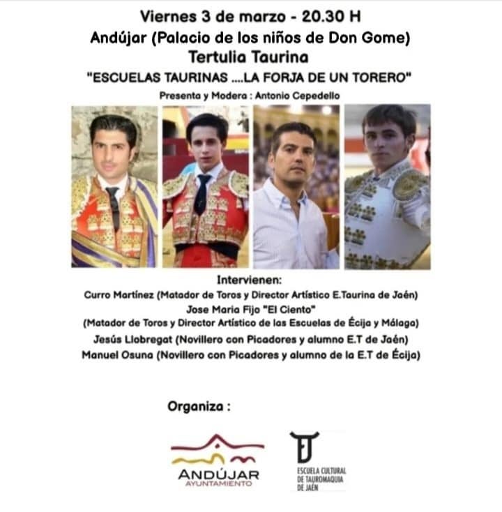 Por otro lado, a partir de las 20:30 horas tendrá cabida una tertulia taurina bajo el nombre «Escuelas Taurinas…La Forja de un Torero», moderada por el periodista Antonio Cepedello que contará con las intervenciones del torero y director de la Escuela Taurina de Écija y Málaga, y presidente de la Unión Internacional de Escuelas Taurinas, Jose María Fijo «El Ciento»; el torero y director artístico de la Escuela Taurina de Jaén, Curro Martínez; y los novilleros con picadores y alumnos de las Escuelas Taurinas de Jaén y Écija, Jesús Llobregat y Manuel Osuna, respectivamente.