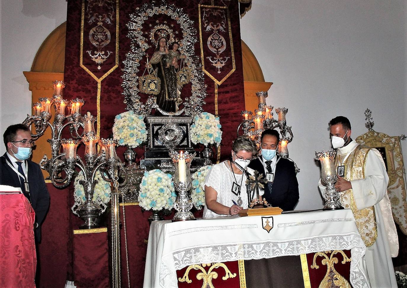 La pandemia impidió por segundo año consecutivo la procesión de la Virgen del Carmen, pero las puertas del templo de Santiago Apóstol evocaron un monte Carmelo especial, adornado por la sencillez de un enclave y la mansedumbre de su vega. Asistieron a la Misa miembros de la Corporación Municipal, la junta de gobierno de la Virgen del Carmen y representantes del resto de varias cofradías de la ciudad. La Eucaristía estuvo presidida por el párroco de Santiago Apóstol, Antonio José Morillo (vivió su primera fiesta de la Virgen del Carmen) y cantada por el coro parroquial de Santa María, cuyas notas le dieron empaque a la Eucaristía. Emotiva fue al final la despedida del hermano mayor, José David Checa, quien derrochó en su discurso una honda gratitud y un sentido fervor.