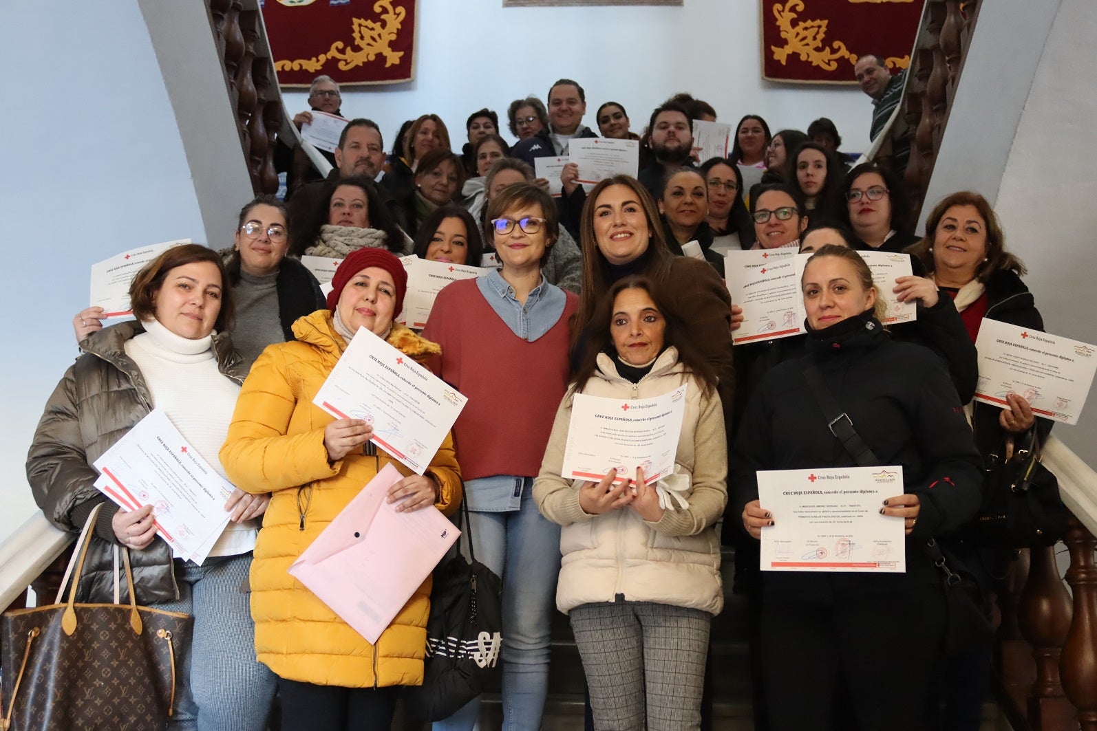 La formación acreditada sirve para mejorar las competencias profesionales a la hora de acceder a la bolsa de empleo del Sistema Andaluz de Salud. El objetivo de este acuerdo entre el Área de Formación del consistorio con Cruz Roja, que acoge dichos cursos, es mejorar la inserción laboral de las personas que buscan un empleo en la ciudad. La concejala de Formación del Ayuntamiento de Andújar, Teresa Fernández-Pacheco y la técnica de formación de Cruz Roja Jaén, Rosa María Mármol, hicieron entrega de los diplomas acreditativos en el salón de pleno del Palacio Municipal.