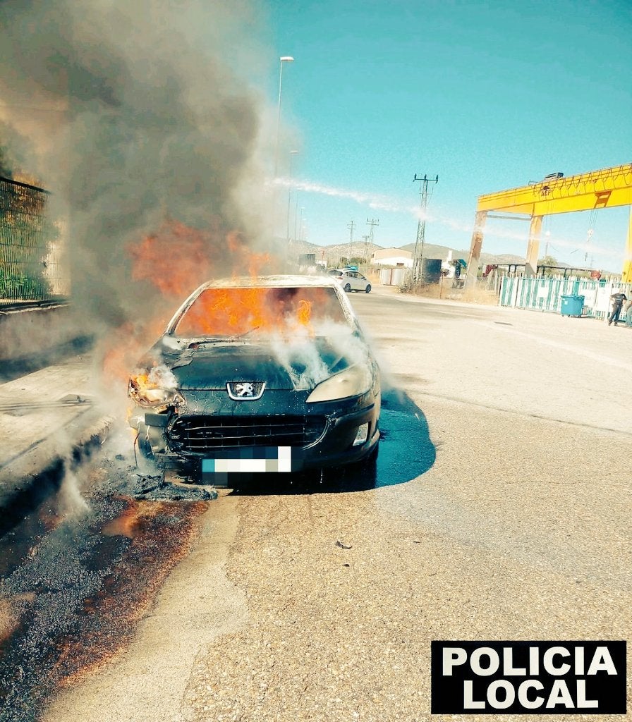 Una patrulla del cuerpo de la Policía Local andujareña se dirigió tras un aviso del 112 al polígono Ave María, donde se produjo el incendio del vehículo tras un accidente.