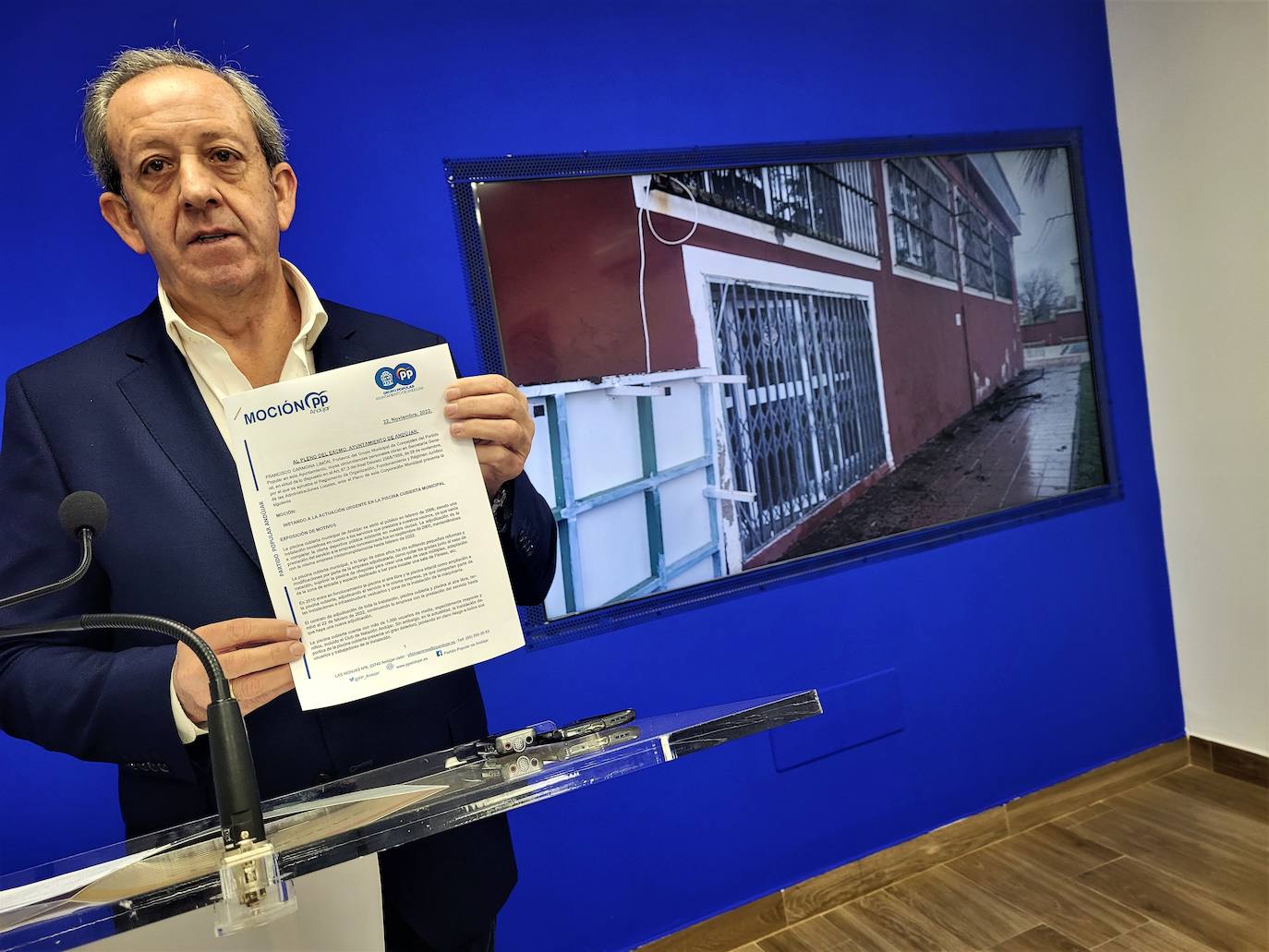 El portavoz municipal del grupo popular y candidato a la alcaldía, indicó que la piscina cubierta necesita una actuación integral urgente para garantizar la seguridad de todos los usuarios y trabajadores. Señaló que parte de la estructura del techo está oxidada y añadió que las placas del cielo raso se desprenden con cierta frecuencia, tanto en algunas salas como en el techo del propio vaso de natación.