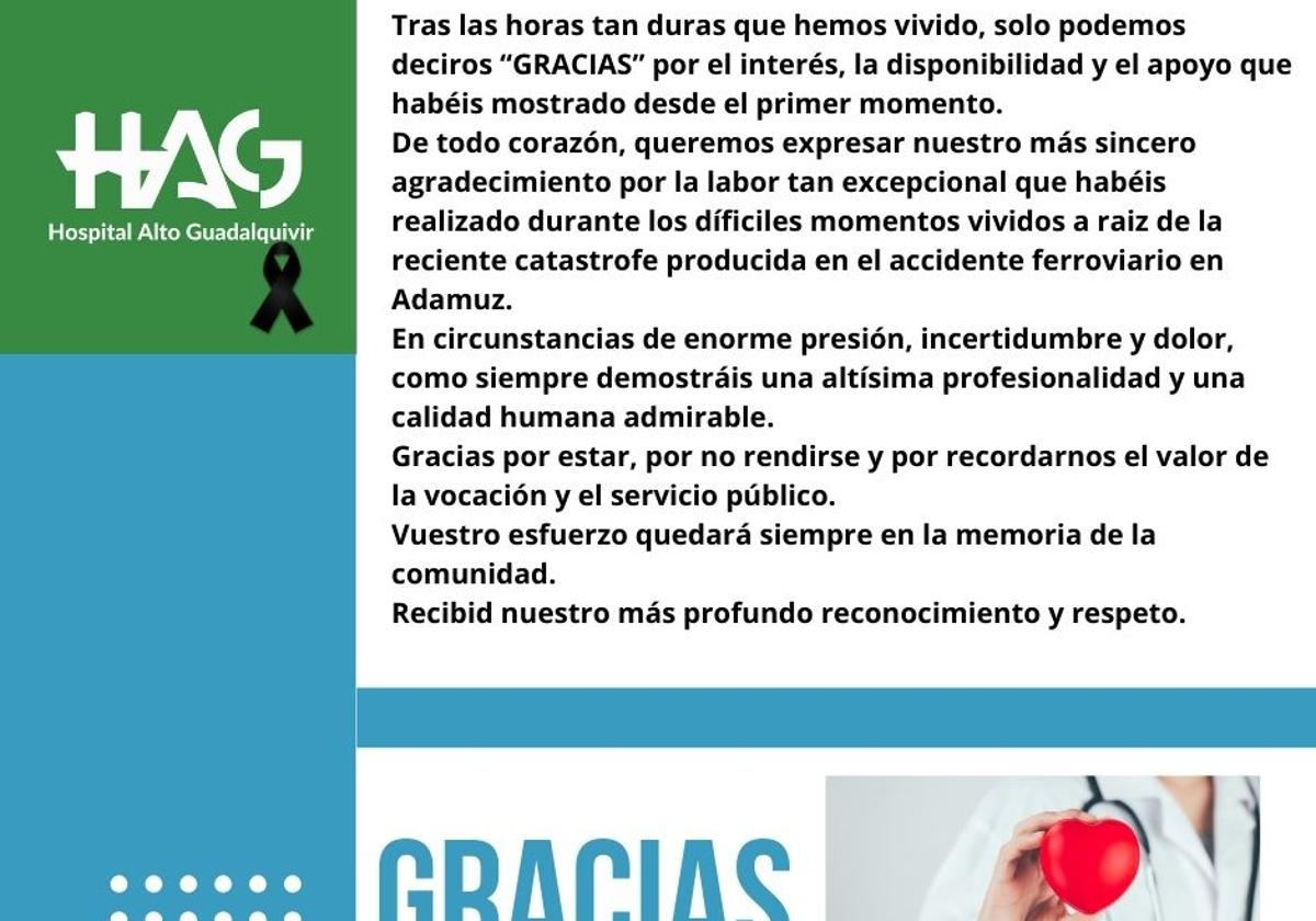 El Hospital Alto Guadalquivir ha reconocido públicamente el trabajo de sus profesionales por su asistencia en el accidente ferroviario de Adamuz, la localidad cordobesa que ... se halla a 62 kilómetros de Andújar, lo que propició el traslado de 20 heridos leves gracias a la coordinación de todo el dispositivo de emergencias y al traslado de los integrantes de Protección Civil de Andújar.