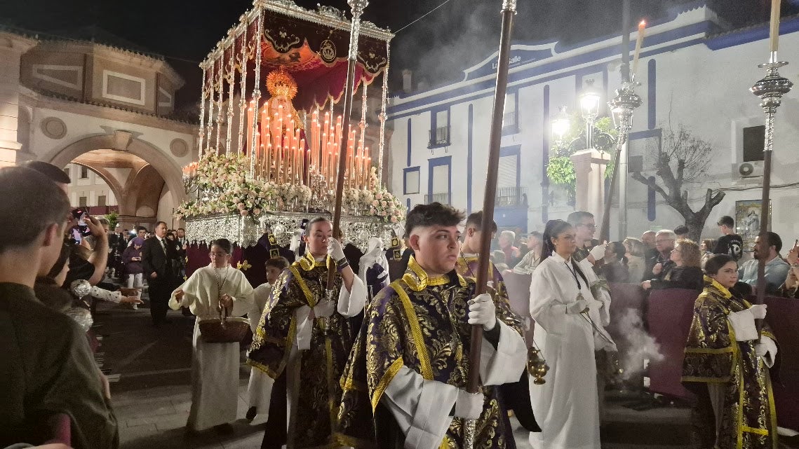 Es el momento en que a Jesús hombre le abate un miedo aterrador, esculpido magistralmente por el gran artista iliturgitano Luis Aldehuela en el año 1948, cuando Jesús suda sangre, una odisea terrible glosada en unos grandiosos versos por el inolvidable Joaquín Colodrero. El Arco de Capuchinos y la iglesia de la Divina Pastora se convirtieron en el Getsemaní y el Huerto de los Olivos. Este turbador y pavoroso momento es quebrantado por las ramas de olivo mecidas por la ligera brisa del crepúsculo iliturgitano, el racheo de los costaleros y el requiebro de las bambalinas de una Virgen dolorosa, cobijada por un luto de terciopelo de oro que adornan su abatimiento y hondo pesar. La historia se repite cada año desde que un grupo de jóvenes de Acción Católica de la Divina Pastora impulsaran en los confines de la década de 1940 esta advocación, que en los últimos tiempos ha adquirido resonancia y empaque tras cumplir su 75 aniversario y participar en la Magna del pasado día 4 de octubre en Jaén.