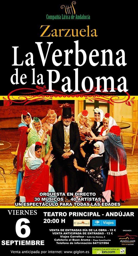 El mundo de la zarzuela irrumpe de nuevo en la Feria de Septiembre. Este viernes día 6 de septiembre, a las ocho de la tarde, ... llega al Teatro Principal 'La Verbena de la Paloma', a cargo de la Compañía Lírica de Andalucía que ha realizado más de 150 espectáculos por toda España y está llevando el nombre de la provincia y de Andújar por todo lo alto a nivel cultural.