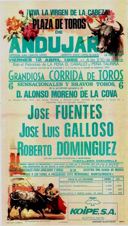 El cartel cayó bien entre la afición. Lo encabezaba José Fuentes, el maestro de Linares, que acababa de salir de una muy seria lesión cervical que se había producido al pisar una almohadilla en la plaza de Barcelona temporadas atrás. También se anunciaba a José Luis Galloso, conocido y querido en una plaza como esta en la que había obtenido grandes triunfos. Y para completar la terna, un debutante, Roberto Domínguez, que por entonces arrastraba el sello de eterna promesa que no acababa de despegar, sin que nadie atisbase la figura del toreo en que se iba a convertir apenas dos años más tarde. Los toros, de Alonso Moreno de la Cova, que aunque anunciados como de Palma del Río, llegaron desde la finca "Cueva Plaza", en la conquense Horcajo de Santiago, según me contó hace poco José Joaquín Moreno de Silva, hijo del ganadero titular. La mañana amaneció espléndida y mucha gente, como es costumbre, acudió a ver el "manifiesto" de los seis toros de Alonso Moreno más el sobrero, que era de los herederos de Román Sorando. Se cerraron pronto las puertas de acceso a los corrales esa mañana, que ya sólo pudieron franquear los profesionales, entre ellos Joaquín Jesús Gordillo, por aquel entonces jefe de las retransmisiones taurinas de TVE, y que ese mismo año gestó un proyecto televisivo del que surgió "Tendido 0", uno de los programas más longevos en la historia de nuestra televisión. Su segundo de a bordo, que hizo las labores de apoyo en los comentarios e hizo las entrevistas en el callejón fue Fernando Fernández Román, que ese día transmitió la primera corrida de las muchísimas que locutaría a lo largo de años posteriores.