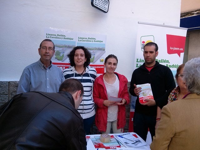 El coordinador local de IU Juan Antonio Sáez Mata, acompañado de los miembros de la candidatura a las elecciones municipales, Lourdes Castro, Nadia Navas, Raúl Cárdenas, Beatriz Salas y Rosa Bárcenas han realizado una nueva recogida de firmas para apoyar el Plan de Reindustrialización de Linares, Bailén, La Carolina y Andújar, aprobado por unanimidad por el Parlamento Andaluz en la anterior legislatura.