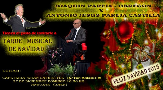 El próximo domingo 27 de diciembre el pianista y artista Joaquín Pareja Obregón, volverá a visitar Andújar para interpretar temas flamencos y navideños junto al compositor local y pianista, Antonio Jesús Pareja Castilla. Este espectáculo que será gratuito tendrá lugar en el Gran Café Style a las 16:30 horas. Sonarán temas conocidos de su padre y suyos propios junto a Antonio Jesús quien hará un recorrido de algunos temas de los maestros pianistas flamencos.