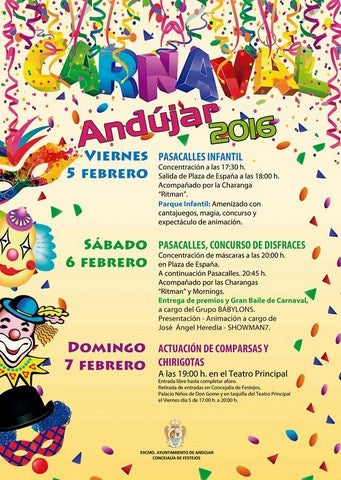 El próximo fin de semana la ciudad de Andújar celebrará de forma intensa la fiesta del Carnaval. Durante esta semana son muchos los centros escolares que desarrollarán actividades relacionadas con las máscaras y los disfraces para divertir a los más pequeños de la casa. El Ayuntamiento de Andújar, a través de la concejalía de Festejos ha desarrollado una programación con la actuación de chirigotas y comparsas en el Teatro Principal como novedad.