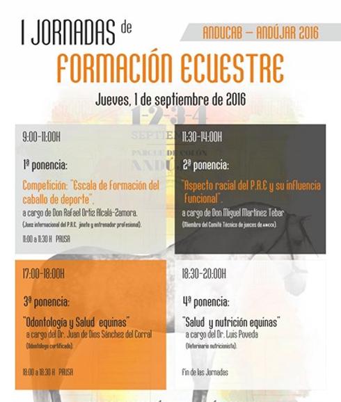 El 1 de septiembre, día del comienzo de esta edición, el juez internacional de PRE, Rafael Ortiz, incidirá sobre la escala de formación del caballo en el deporte. Le seguirá Miguel Martínez, miembro de ANCCE que tratará el aspecto racial del pura raza español y su influencia funcional. Por la tarde Juan de Dios Sánchez expondrá aspectos de ondontología y salud equinas y cerrará la jornada el veterinario Luis Poveda ahondando en la salud y nutrición equinas.