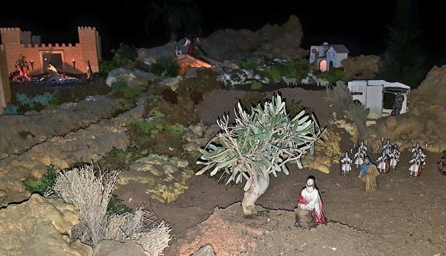 Esta representación se ha ubicado en el mismo lugar que el belén, aunque el montaje es totalmente distinto «aunque se han podido aprovechar algunas piezas», explica el párroco de San Bartolomé, quien lo ha creado junto con dos personas más, un padre y un hijo, que son feligreses de la parroquia, «les propuse la idea y gustosos hemos trabajado en esta iniciativa que nos ha llevado de trabajo desde finales de enero hasta el Miércoles de Ceniza», cuenta Manuel Jesús.