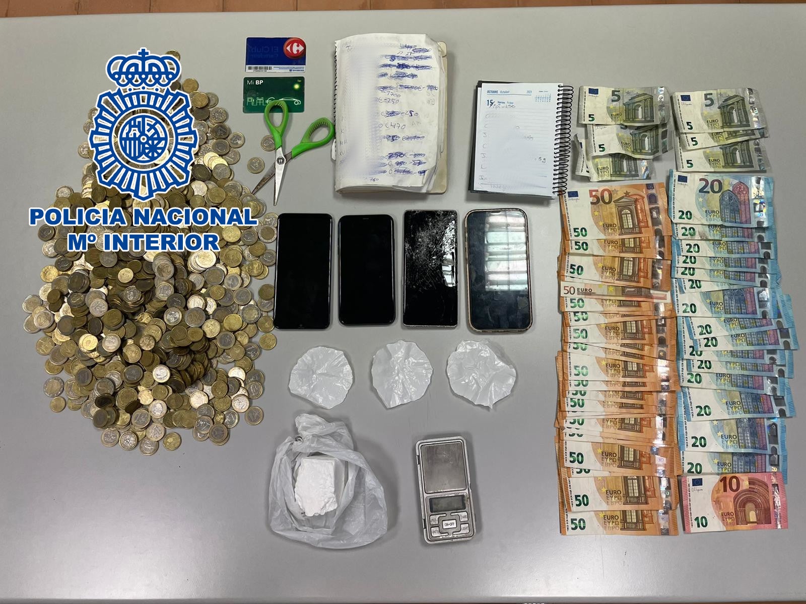 En el registro de la vivienda, los agentes decomisaron 110 gramos de cocaína, una balanza de precisión, cuatro teléfonos móviles, diferente documentación, utensilios para la elaboración, corte y dosificación de droga y 3.000 euros en efectivo.