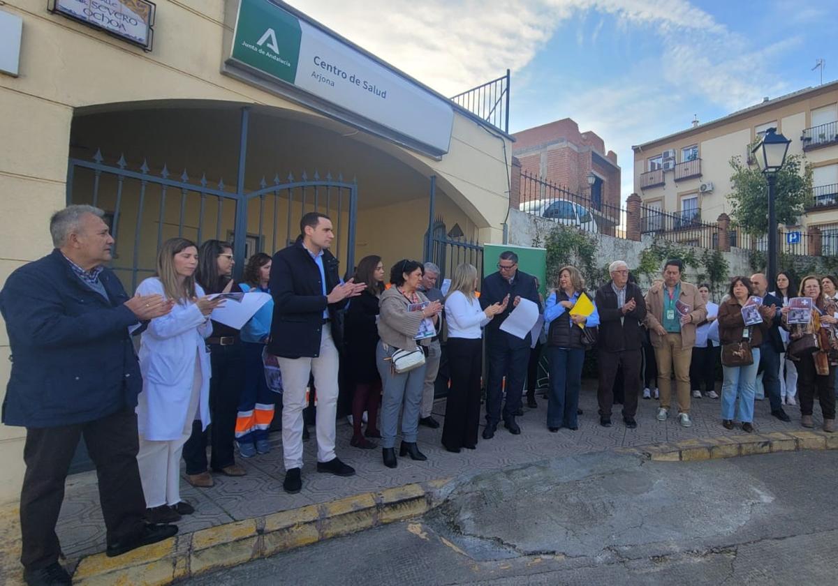 La delegada territorial de la Consejería de Sanidad, Elena González, junto al director gerente del Área de Gestión Sanitaria Norte de Jaén, José Luis García, ... miembros del equipo directivo, todas las organizaciones sindicales de la Junta de Personal así como profesionales sanitarios del centro de salud de Arjona se han concentrado de forma conjunta este lunes a las 9 horas en la puerta del edificio para mostrar su apoyo y solidaridad a las dos profesionales de este centro de Atención Primaria, perteneciente a este área sanitaria, por la agresión sufrida el pasado lunes,16 de marzo, mientras realizaban su trabajo asistencial.
