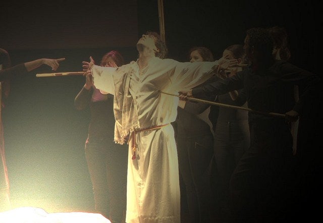 El espectáculo consta de ocho escenas. Una introducción flamenca con música en directo, donde la percusión y el cante flamenco por bulerías introducen lo que va a suceder. Una segunda entrada en Jerusalén representada con el pueblo samaritano y ramas de olivos y Jesucristo a través de la marcha 'Oh! bendita Estrella'. Una tercera escena donde se muestra el dilema de Jesús en el desierto tentado por el demonio y guiado por el Ángel Gabriel con la marcha 'Oración en el Huerto'.