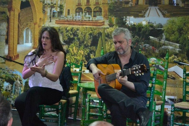 Uno de los momentos más espectaculares vividos en la sede de la peña flamenca fue cuando se subió al escenario la onubense Regina que deleitó al público con soleás, granainas y seguiriyas, además de fandangos de su tierra.