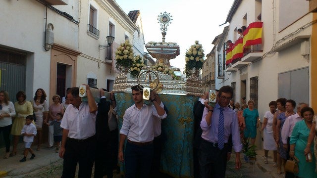 Novedoso resultó el horario, pues se ha optado por una procesión de tarde, a diferencia de lo que venía siendo habitual. Todos los niños y ... niñas que hicieron la Primera Comunión este año acompañaron el trono durante su recorrido. También los representantes de las cofradías locales portando sus estandartes formaron parte del cortejo.