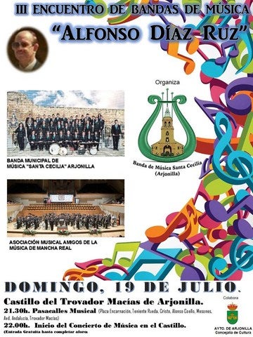 La Banda Municipal Santa Cecilia de Arjonilla y la Agrupación Musical de Amigos de la Música de Mancha Real ofrecerán un amplio repertorio a partir ... de las 22:00 horas en el Patio de Armas del Castillo del Trovador Macías de Arjonilla.