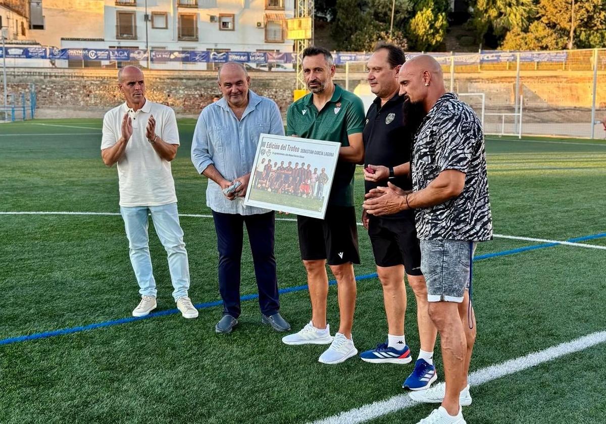En la previa del choque se vivieron momentos emotivos. Los biznietos de Sebastián García Laguna hicieron el saque de honor y la directiva del conjunto iliturgitano le entregó al entrenador del Real Jaén, Manuel Herrero, una foto de su etapa de juvenil en el conjunto azulgrana, cuando era entrenado por el propio Laguna.
