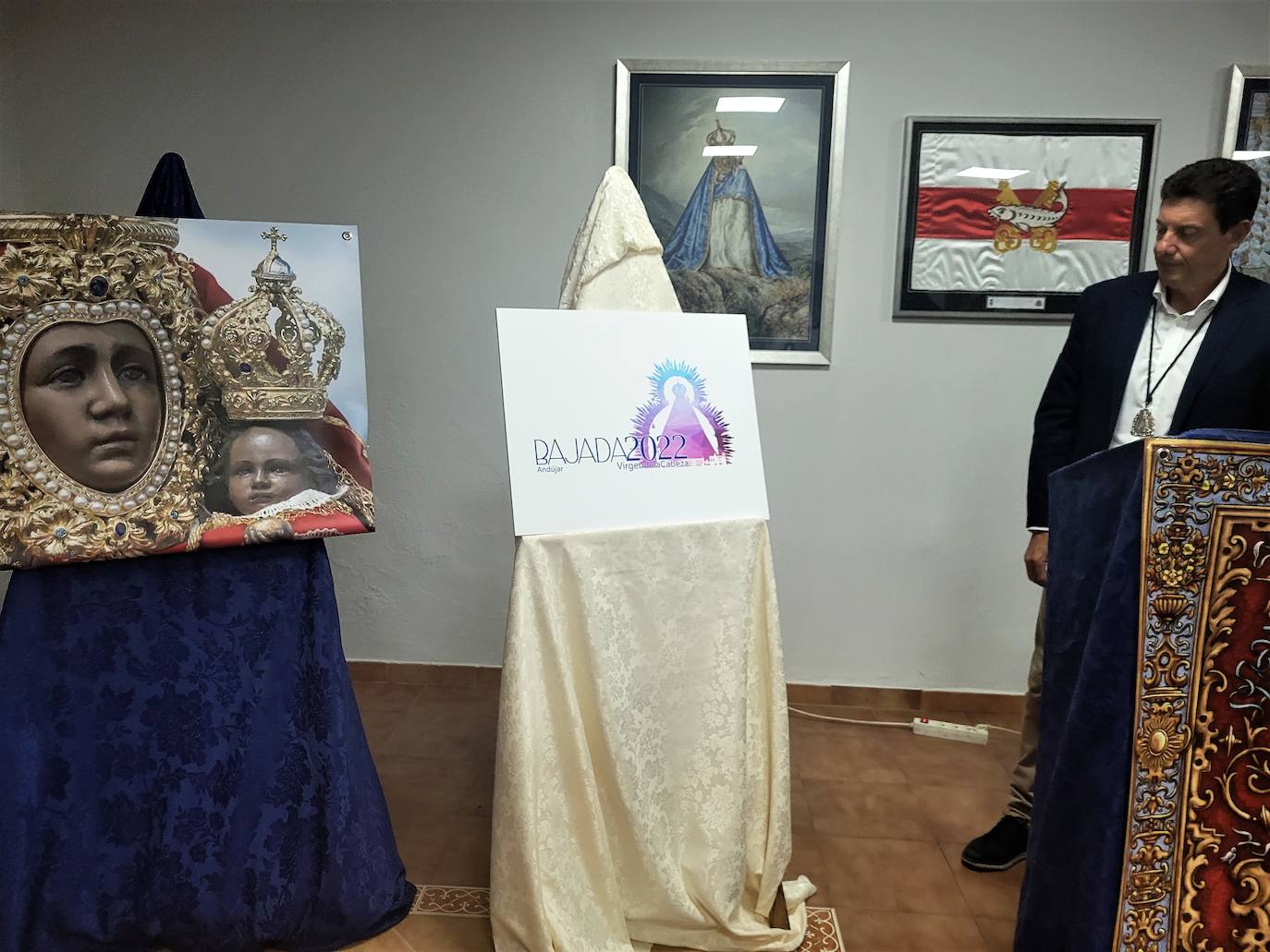 Dos colgaduras con la imagen de la Virgen y otra alegórica une hace referencia a la devoción, se pondrán a la venta junto con los artículos para que los balcones se engalanen con una imagen unificada de la Virgen en esos días tan apasionantes.