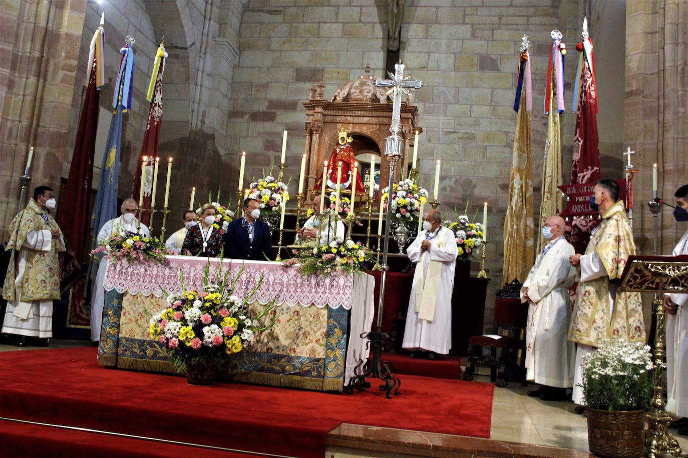 La parroquia de San Bartolomé ha albergado esta mañana la Eucaristía que sustituye a la misa de romeros del sábado por la mañana y a la presentación de la Matriz en su Santuario por la noche. Ha estado presidida por el arcipreste de la ciudad, Pedro Montesinos y concelebrada por el resto de sacerdotes y los dos diáconos permanentes. El arcipreste ha invitado a los hermanos mayores de la Cofradía Matriz, Isabel y Antonio Barrios, a subir al altar al final de la Misa para que convirtieran sus incensante vivas a la Virgen en los rezos y plegarios de sus devotos que no podrán contemplarla, en medio de una sonora e interminable ovación de los asistentes. Será una estampa histórica en una romería inédita.