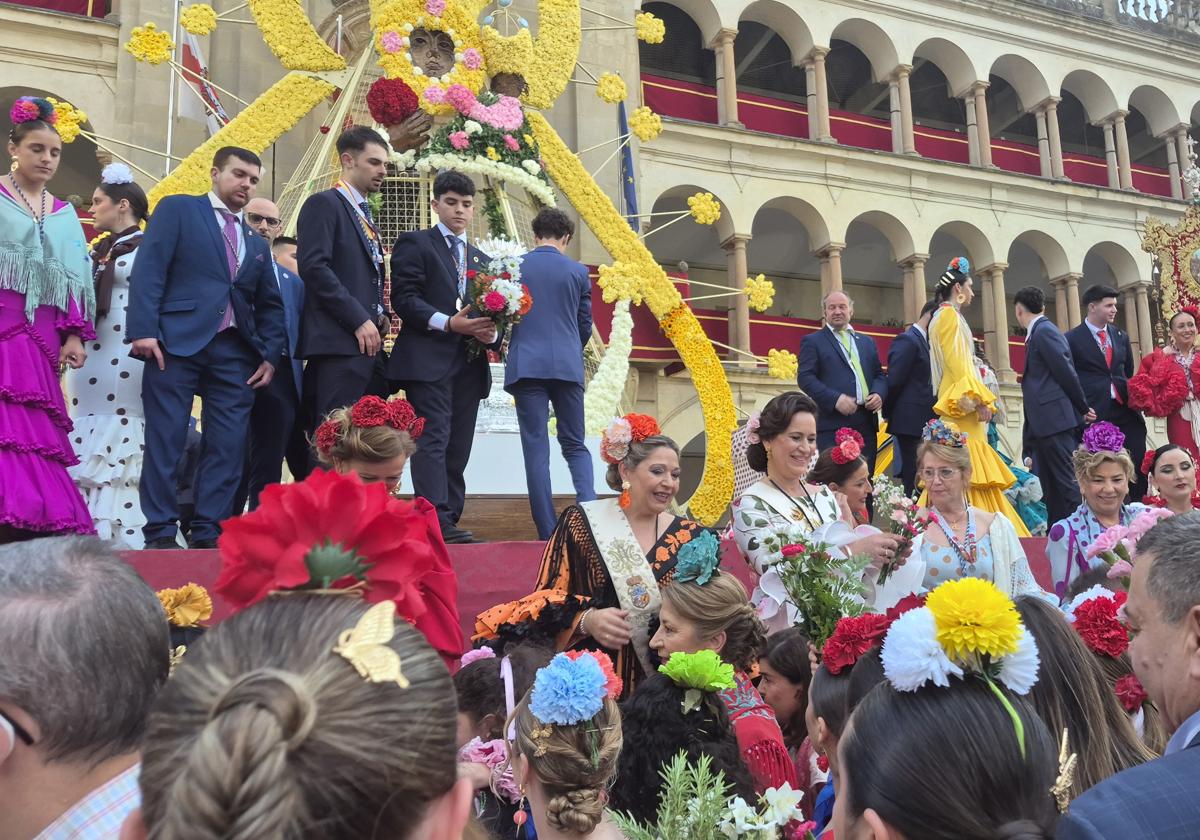 Una vez en la plaza, tiene lugar la ofrenda floral, presidida por representantes de la Cofradía Matriz, el Ayuntamiento, la Orden Trinitaria y el clero. Miembros de colectivos, centros educativos, cofradías filiales y peñas romeras depositan sus flores ante la Virgen, conformando un amplio y vistoso manto floral que condensa el amor de un pueblo hacia la 'Reina de Sierra Morena', y de los corazones.