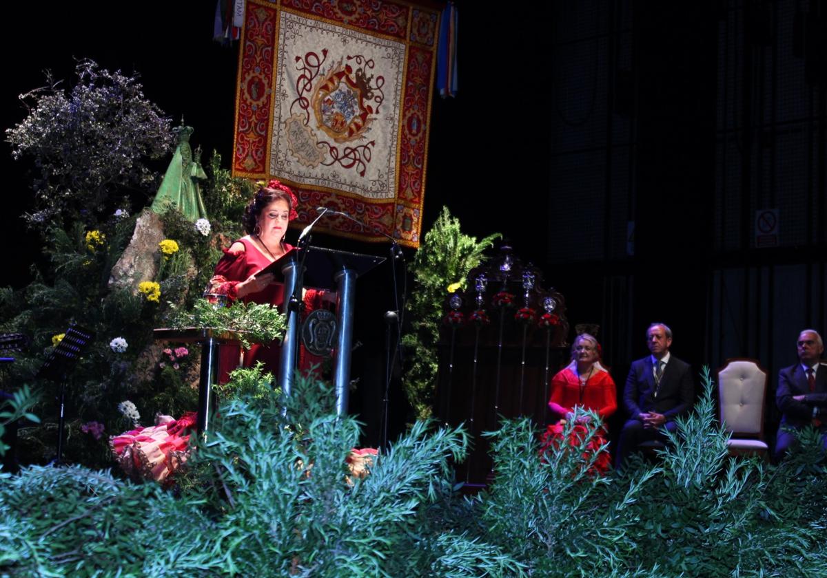 La declamadora acompañó de música y baile a sus sentidas y orfebres palabras en torno a la Virgen de la Cabeza, a que le profesa un profundo amor que le transmitió su familia desde muy pequeña, como a los miles de andujareños. Su introducción, cargada de plegaria y lirismo, se construyó con la gratitud de haber cumplido un sueño y se remontó hasta la génesis de la devoción, la legendaria aparición de la Virgen de la Cabeza al pastor Juan Alonso de Rivas. Alabó en este sentido la labor investigación del José Carlos de Torres Laguna