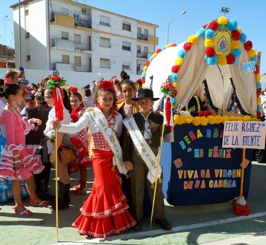 Alrededor de 1.100 escolares de los colegios de Primaria de la ciudad, participaron ayer en la XII Romería Escolar que ya se ha ganado su hueco en los actos romeros que se organizan en la ciudad. Este evento volvió a causar una gran expectación, porque los vecinos y visitantes se agolparon en las calles céntricas de la ciudad, para presenciar el séquito de cofradías, jamugas, caballerías, banderas y cetros, que en la jornada de ayer tuvieron como protagonistas a los escolares de la ciudad.Una de las novedades de la presente edición ha sido la elaboración de una carreta a cargo del alumnado del colegio Félix Rodríguez de la Fuente, por lo que ha aportado otro elemento que dota a la Romería de un tipismo especial.