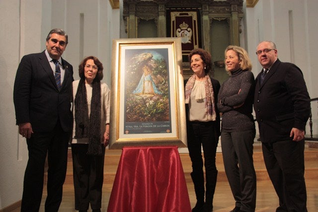 El cartel está protagonizado por la Virgen de la Cabeza fundamento teológico y cristiano de esta devoción mariana que arranca en el tiempo histórico de la Reconquista, en el año de 1227. Juan Vicente Córcoles constató que Luís Aldehuela creó un espacio y ambiente único, con una figura bajo unas tonalidades luminosas muy difíciles de captar; "nos da un anacronismo al aparecer la imagen vestida como lo hizo el Barroco; hábito o saya con manto, rostrillo y corona que esconde una bella talla de madera", remarcó el presentador del cartel quien subrayó que los colores como el blanco y el azul que figuran en la obra: "No son colores ajenos a la divinidad de la figura y nuestro pintor ha sabido interpretar su simbología", especificó el presentador.