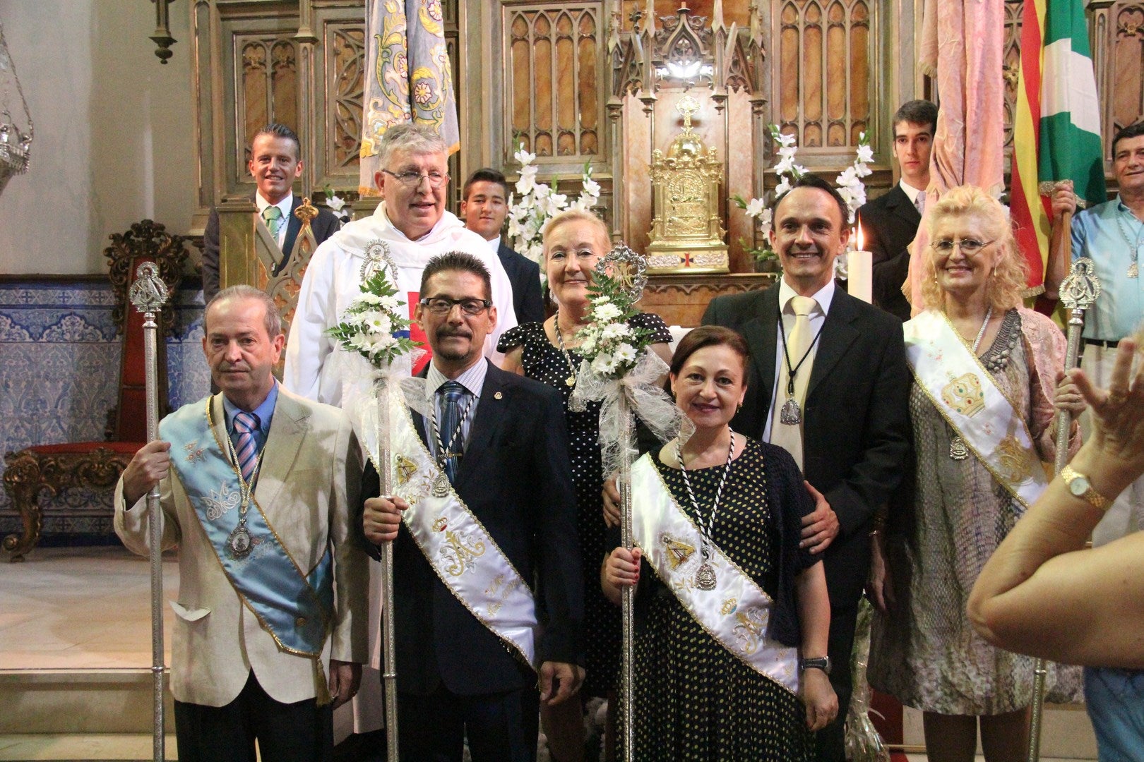El presidente de la cofradía Matriz, Alfredo Fernández, junto a miembros de su directiva y los Hermanos Mayores, Araceli González y Emilio García acompañaron en el recorrido al presidente de la filial catalana, José Ortiz y los Hermanos Mayores José Miranda y Lucía Bujaldón. A las puestas del templo los recibieron el párroco y rector de la Basílica Santuario, Domingo Conesa, y el concejal de Festejos, Curro Martínez. Un sencillo pero emotivo acto de recibimiento que fue completado con una ofrenda floral llenándose los piés del altar de multitud de ramos de margaritas blancas.