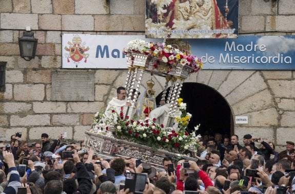 La Virgen lucía la corona y rostrillo de la Recoronación de 1960 diseñada por el artista Antonio González Orea, Vestía manto y saya bordadas por la esposa del Hermano Mayor de Andújar, Mercedes Fernández, un manto azul de simbología muy romera y jienense. La procesión se retrasaba en su salida, como casi siempre, aunque los tiempos por momentos se eternizaron. Pero cuando la imagen de la Virgen de la Cabeza se volvía a situar sobre sus andas, los sentires heredados de padres a hijos, los sueños, los agradecimientos, los anhelos, sacudían las emociones. La Virgen de la Cabeza volvía a cumplirse a sí misma en su propia metafísica, rompió los amarres de la realidad para trasladar a los muchos miles de romeros al zaguán de la gracia.
